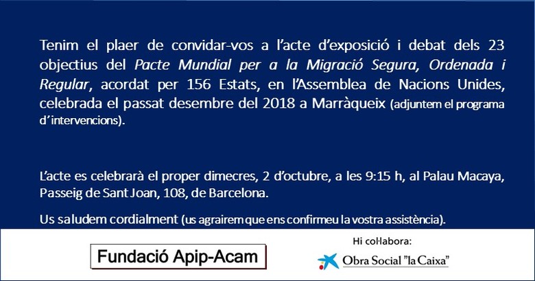 El proper dimecres, dia 2 d'octubre de 2019, de 9.15h a 14.00h, tindrà lloc al Palau Macaya de Barcelona, un acte sobre el Pacte Mundial per a la Migració Segura, Ordenada i Regular. Esteu tots convidats!