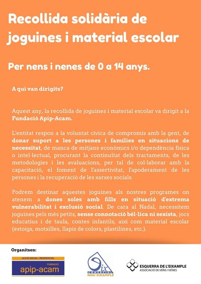 Avui 2 de desembre arrenca la campanya solidària de joguines i material escolar, organitzada per la Fundació Apip-Acam, l’Eix Comercial Nou Eixample i l’Associació de Veïns i Veïnes de l’Esquerra de l’Eixample.